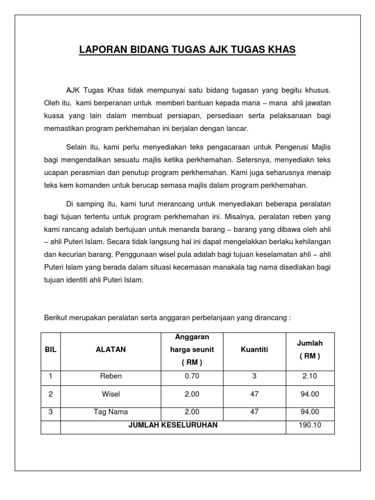 Laporan biasanya mempunyai format khas yang mengandungi tajuk muka surat pengenalan ringkasan senarai kandungan atau isi senarai cadangan atau isi senarai cadangan penutup dan lampiran. Kesemua budaya ini telah mempengaruhi antara satu sama lain menghasilkan suatu budaya Malaysia yang unik. Masjid ialah tempat beribadat yang khusus seperti solat dan iktikaf bagi orang IslamBangunan ini juga merupakan pusat kebudayaan muamalat dan perkembangan dakwah Islamiah serta pusat aktiviti umat IslamMasjid tidak mempunyai rupa bentuk yang tetap tetapi bergantung kepada budaya.